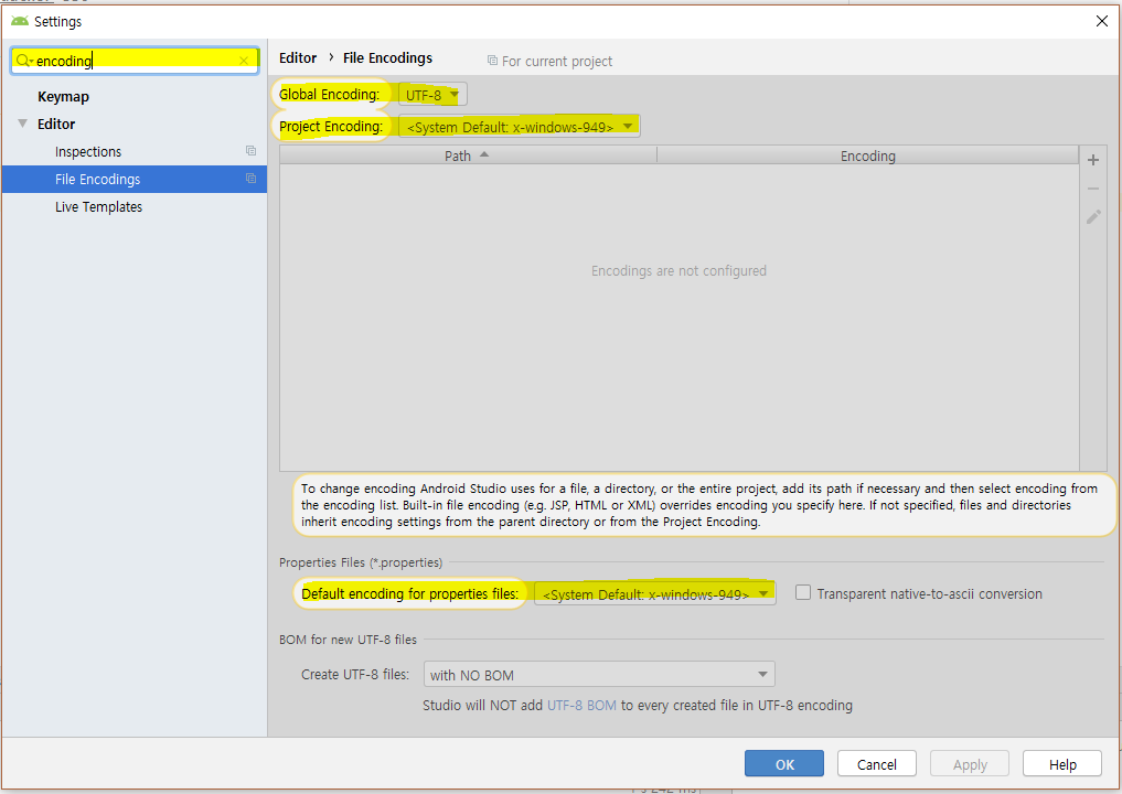 개발/안드로이드 gsjava 안드로이드 스튜디오 인코딩 변경하기 by 철권 2020. 1. 20. 728x90 파일 > 셋팅(Settings) 검색에 encoding 입력 이렇게 하지 않으면 메뉴찾기가 너무 어려움 원하는 인코딩으로 변경후 저장 728x90 반응형 공유하기 게시글 관리 developmentlee 저작자표시 (새창열림) '개발 > 안드로이드' 카테고리의 다른 글 gsjava lib/arm64, /system/lib64, /vendor/lib64]]] couldn't find "libmain.so" (0) 2020.11.24 gsjava Only the original thread that created a view hierarchy can touch its views. (0) 2019.12.04 gsjava No resource identifier found for attribute 'layout_constraintBottom_toBottomOf (0) 2019.12.04 gsjava AAPT2 error: check logs for details 해결 방법 (0) 2019.12.02 gsjava 안드로이드 스튜디오 System.out.println(); (0) 2019.12.01 관련글 gsjava lib/arm64, /system/lib64, /vendor/lib64]]] couldn't find "libmain.so" gsjava Only the original thread that created a view hierarchy can touch its views. gsjava No resource identifier found for attribute 'layout_constraintBottom_toBottomOf gsjava AAPT2 error: check logs for details 해결 방법