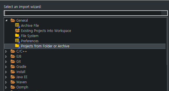 Exisiting Projects into Workspace 대신에 Projects from Folder or Archive 로 바꾸어서 하면 됨