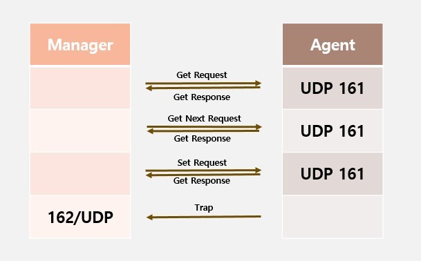 1. 관리 시스템(Manager)은 162/udp 포트를 이용하고 Agent는 161/udp 포트를 이용한다.